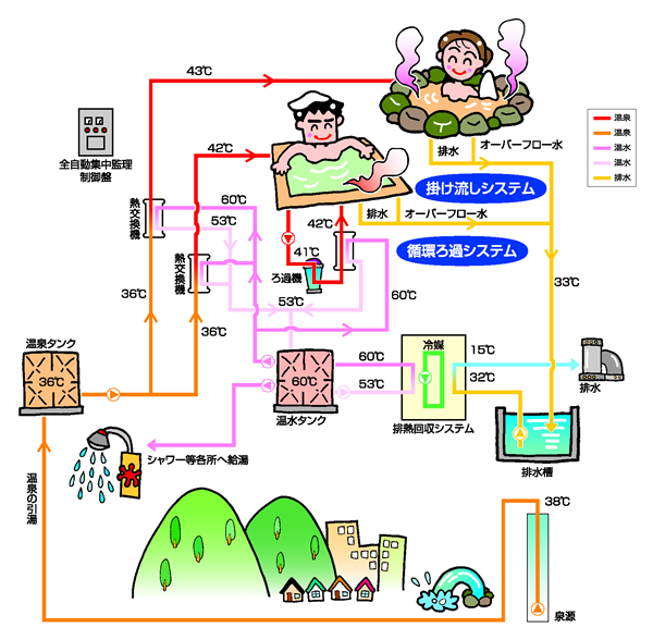 温泉設備 掛け流しも循環もお任せ下さい。 当社は 濾過器メーカーではありません。 温泉システムを構築し施工を行う会社です。 当社は、施設の泉質に適した装置でかつ、コストパフォーマンスに優れたものを選びシステムを構築していきます。